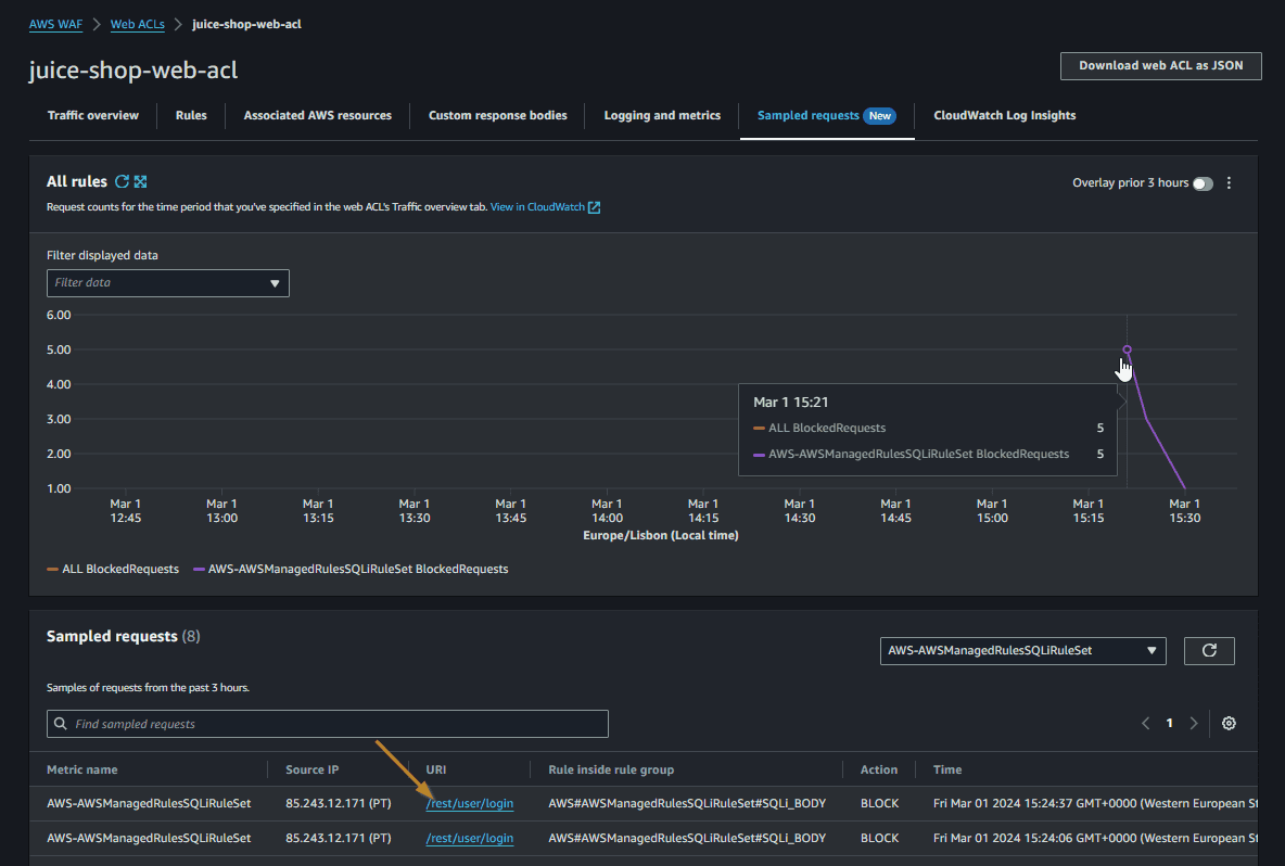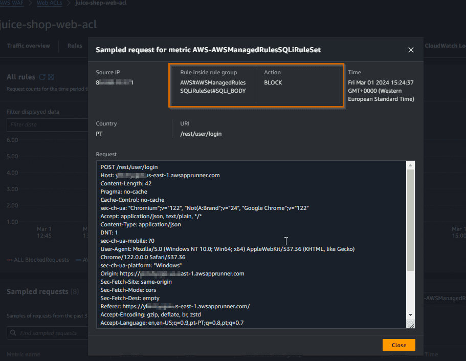 We are being blocked with a 403 Forbidden as expected. Let’s check the WAF sample requests.
