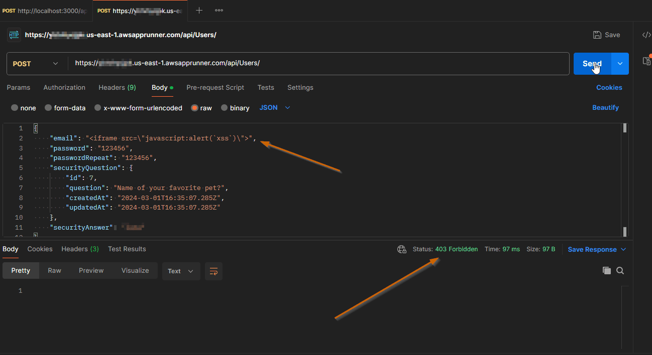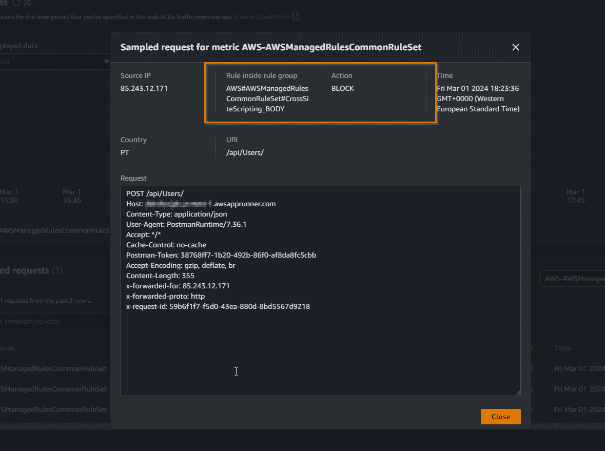 Now let’s repeat the same API request in the version that is running behind WAF in AWS.