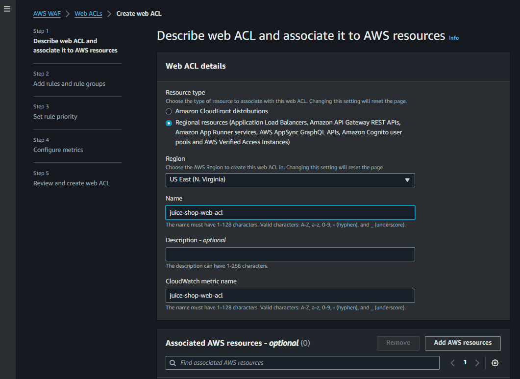 Now that we have Juice Shop running in AWS, let’s put it behind a AWS WAF. We first need create a Web access control list (Web ACL). A Web ACL defines the set of rules we want to apply to our resource, in this case our AWS AppRunner service. We can associate a web acl to protect other resources such as Amazon CloudFront, Amazon API Gateway, Application Load Balancer, Amazon Cognito, etc. Let’s create a web acl with the name juice-shop-web-acl