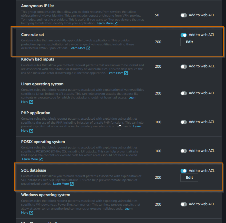 Under AWS Managed Rules, enable the rules that you want to explore. For now I am going to try the Core Rule set to protect against many of the OWASP Top 10 list, and also the SQL database rule set to protect against the popular SQL injection attack.