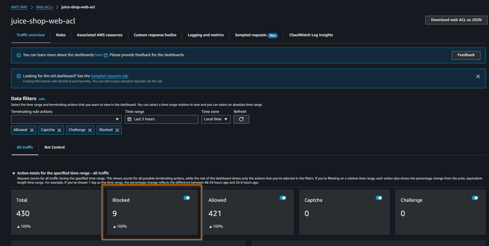 We can check in AWS Web ACL the Traffic Overview