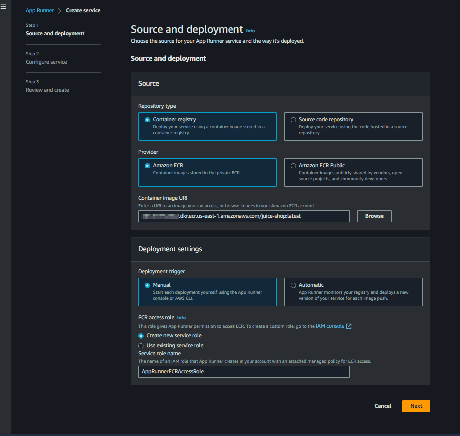 Now we can use this image in our AppRunner Service. Navigate to the AppRunner service and create a new service, specifying the docker image URI for the service
