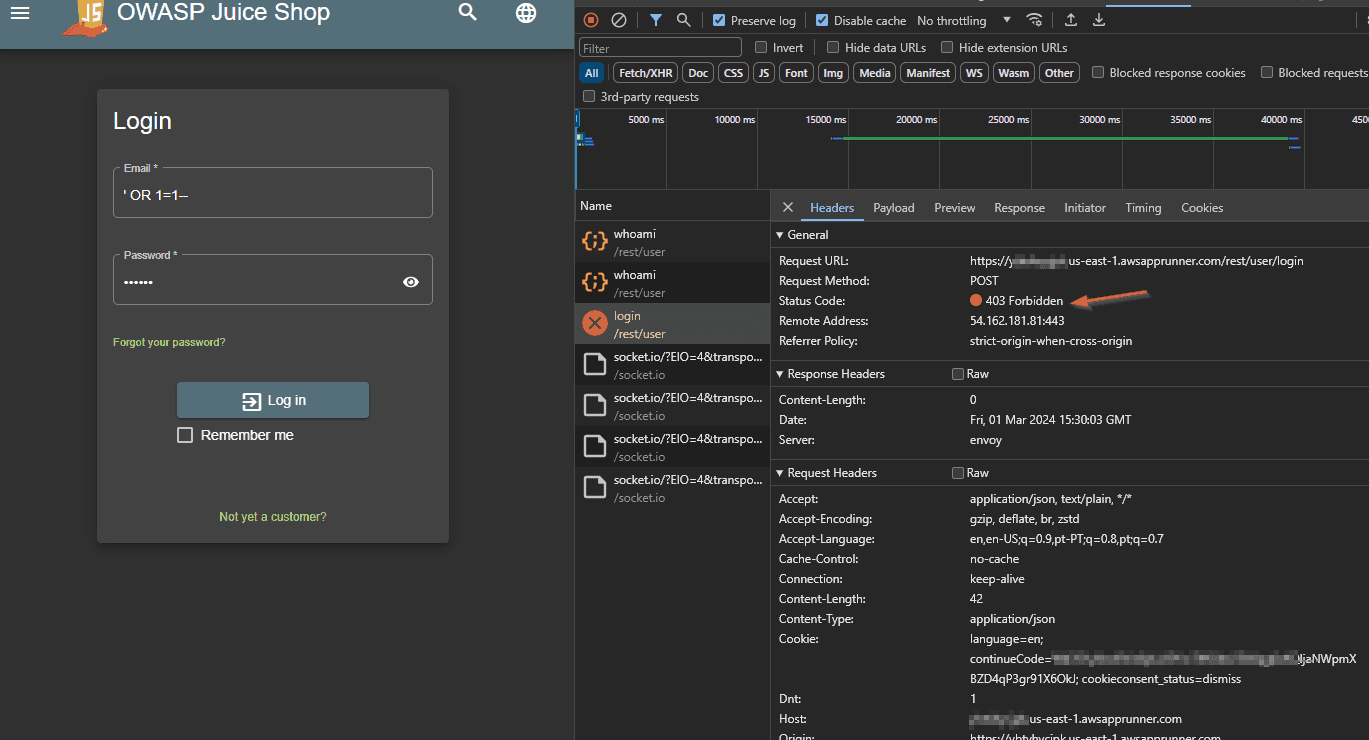 When we click in the Login button, nothing happens. Apparently WAF is blocking the request. Let’s confirm it in the Developer Tools.