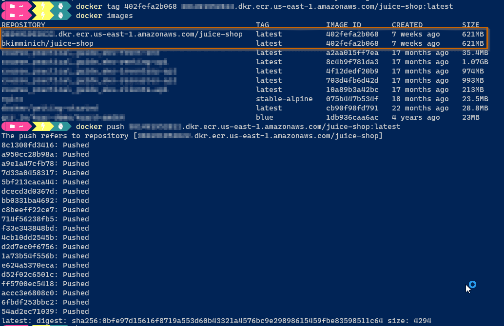 docker tag 402fefa2b068 <account-id>.dkr.ecr.us-east-1.amazonaws.com/juice-shop:latest