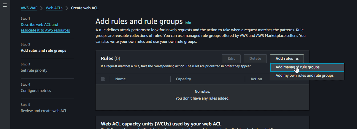 The rules are organized into groups and are maintained by AWS and AWS Marketplace sellers (Fortinet, Cloudbric, F5, etc.). For now, we can go with the defaults on the rest of the wizard.