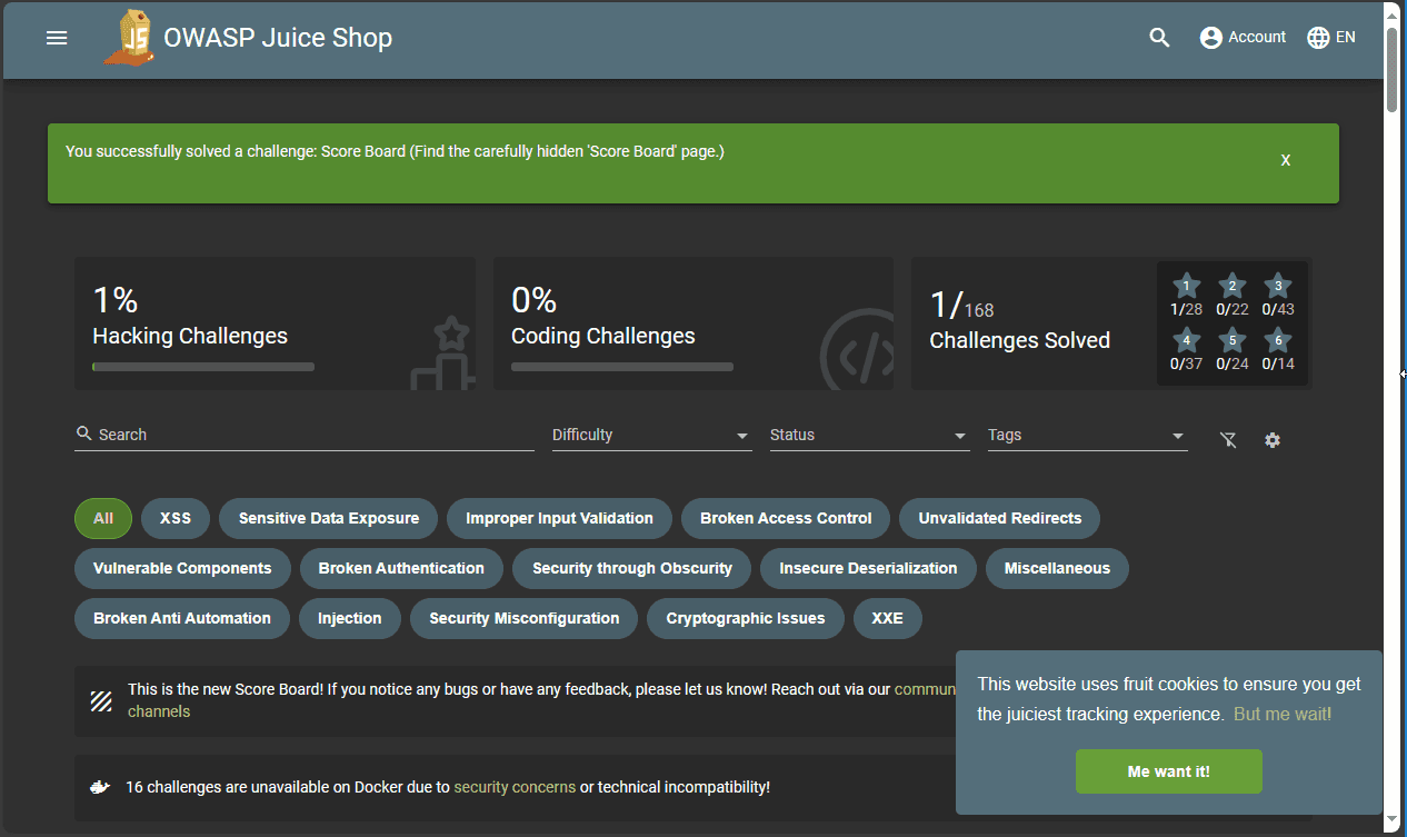 OWASP Juice Shop provides interactive training tutorials, and presents vulnerabilities as challenges that we need to discover. It’s really cool as a training security tool for developers. The first challenge is to discover the Score Board page where you can track your progress.